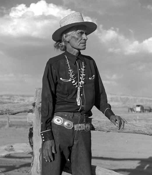 photo by Don Blair of an elderly man in traditional Navajo dress wearing a concho belt turquoise necklace and straw hat