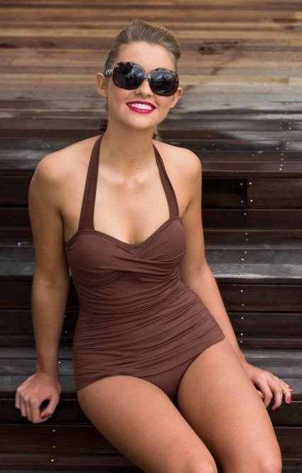 The picture above is an example of what an overly detailed one-piece swimsuit can do to even a fit model. Although it looks nice, the detailing and the flush of contrasting colors fill her in all the wrong places.