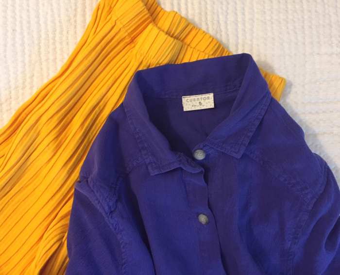 Colorful clothing made in America -- a ribbed pant from Simon MIller and a workshirt (on 5'4" tall me, long enough to wear as a cute dress) from Curator SF